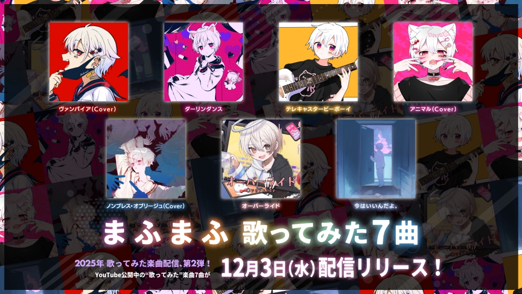 今回配信される7曲は、YouTube再生数が800万回を超える人気曲「ヴァンパイア(Cover)」(作詞・作曲:DECO*27)や、多くのアーティストにカバーされている楽曲「ダーリンダンス」(作詞・作曲:かいりきベア)、「テレキャスタービーボーイ」(作詞・作曲:すりぃ)や、「アニマル(Cover)」(作詞・作曲:DECO*27)、「ノンブレス・オブリージュ(Cover)」(作詞・作曲:ピノキオピー)といった楽曲や昨年まふまふが歌ってみたカバーを公開した楽曲「オーバーライド」(作詞・作曲:吉田夜世)、「今はいいんだよ。」(作詞・作曲:MIMI)の全7曲の“歌ってみた”楽曲のサブスク配信が開始されます。