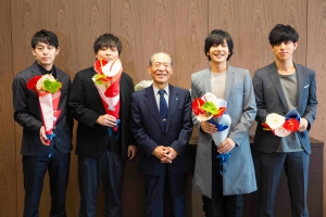 そんなflumpoolが来年デビュー10周年を迎えるにあたり、10周年という一つの節目として、生まれ育った故郷大阪に恩返しをするため地元に根付いた活動、また、flumpoolを小中学生の頃リスナーとして聞いて育った大学生たちに改めて自分たちの楽曲に触れてほしいという思い、地元大阪で近大マグロの完全養殖など、日本の大学の最先端をリードする近畿大学と共に新たなプロジェクトをスタートしたいという強い思いから、今回の表敬訪問を実施する流れとなりました。