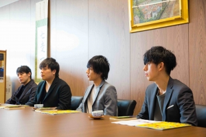 そんなflumpoolが来年デビュー10周年を迎えるにあたり、10周年という一つの節目として、生まれ育った故郷大阪に恩返しをするため地元に根付いた活動、また、flumpoolを小中学生の頃リスナーとして聞いて育った大学生たちに改めて自分たちの楽曲に触れてほしいという思い、地元大阪で近大マグロの完全養殖など、日本の大学の最先端をリードする近畿大学と共に新たなプロジェクトをスタートしたいという強い思いから、今回の表敬訪問を実施する流れとなりました。
