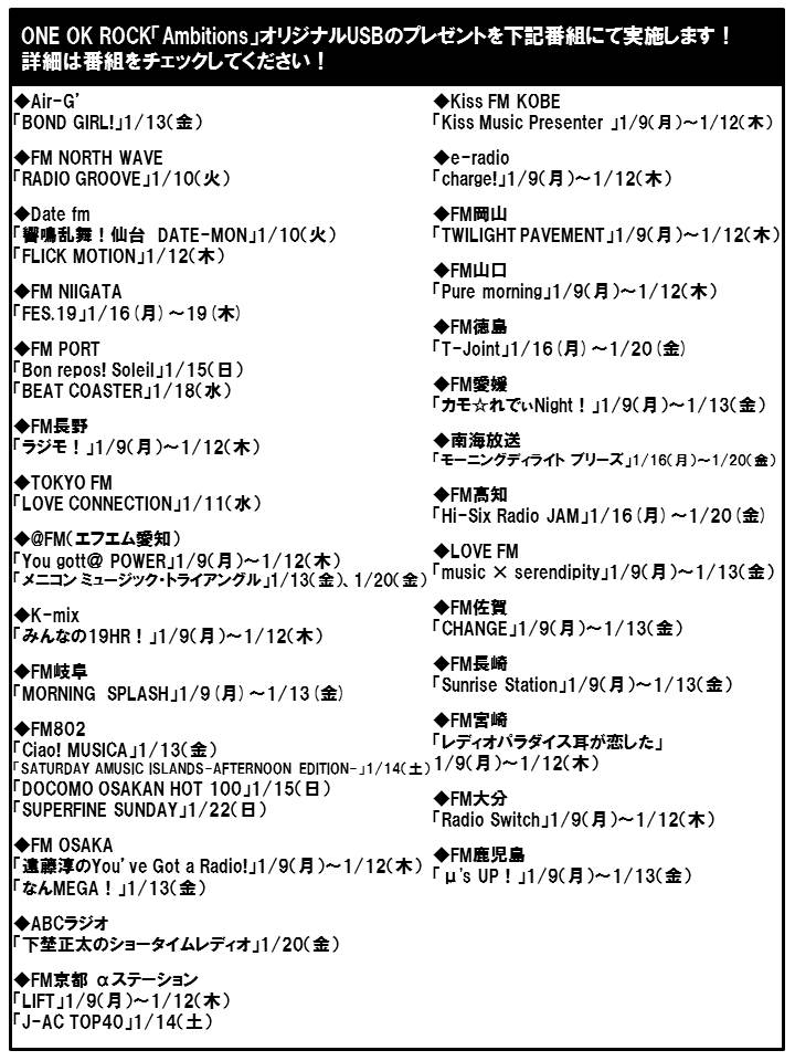 ONE OK ROCK「Ambitions」オリジナルUSBのプレゼントをラジオ番組にて実施!