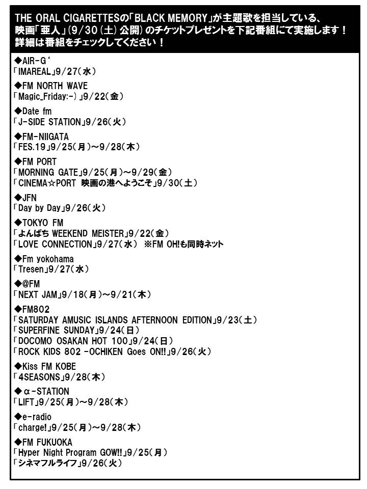 THE ORAL CIGARETTES THE ORAL CIGARETTES「BLACK MEMORY」が主題歌を担当している、映画「亜人」(9/30(土)公開)のチケットプレゼントをラジオ番組にて実施!